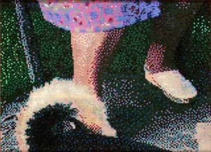 Wer erinnert sich nicht mehr an die Untersetzer, die aus Steckperlen in einfachen Mustern zusammengesetzt und durch die Hitze des Bügeleisens zusammengefügt wurden. Wahrscheinlich schlummern sie auch noch in Ihrem Schrank. Von Einfachheit und angestaubten Untersetzern sind die Bilder aus Steckperlen von Magdalena Drebber jedoch weit entfernt. Allein ihre Größe verweisen auf komplexe Bildwerke, die von der Künstlerin nach Fotografien gesetzt werden. Die Fotografien werden in einzelne Bildpunkte aufgelöst, die wie unter einem Mikroskop sichtbar werden. Das ganze Bild ist eine unzählige Anzahl einzelner Punkte, die sich sonst ob ihrer Kleinheit dem Betrachter entziehen.